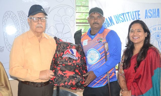 गाजियाबाद। जीटी रोड गाजियाबाद स्थित इंग्राहम इंग्लिश मीडियम स्कूल के दिव्यांगों हेतु संचालित ‘आशा विद्यालय’ में नींव शक्ति संस्था द्वारा एक कार्यक्रम का आयोजन किया गया। जिसमें गुजरात के सूरत में होने वाले सरदार पटेल यूनिटी क्रिकेट कप के लिए चयनित गाजियाबाद नगर के ह्वीलचेयर क्रिकेटर राजा बाबू को सम्मानित किया गया। इस अवसर पर नींव शक्ति संस्था की ओर से इंग्राहम पॉलिटेक्निक इन्सटीट्यूट के डायरेक्टर विंग कमान्डर (retd) प्रकाश जेथ्रो ने राजा बाबू को क्रिकेट किट भेंट की।
