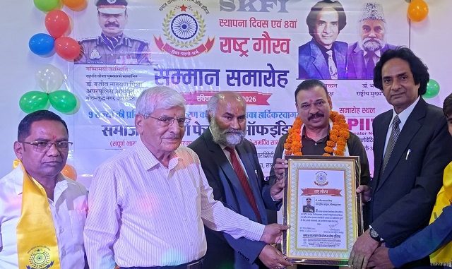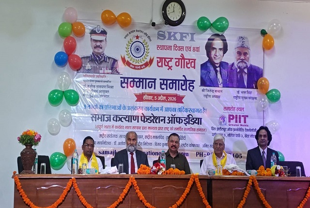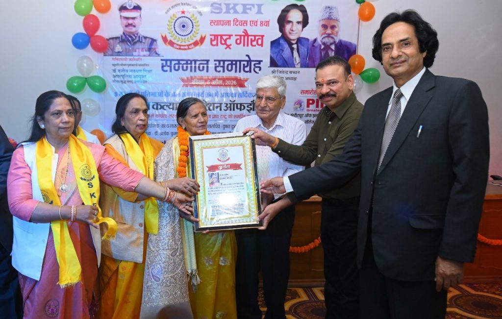 ग्रेटर नोएडा। राष्ट्र को समर्पित समाज कल्याण फेडरेशन ऑफ इंडिया (SKFI) ने अपने स्थापना दिवस के अवसर पर आयोजित 8वें राष्ट्र गौरव सम्मान समारोह में शौर्य, शिक्षा, समाज सेवा, स्वास्थ्य, पर्यावरण, कला-संस्कृति तथा विज्ञान एवं प्रौद्योगिकी के क्षेत्र में नौ प्रदेश की 51 प्रतिभाओं को उनके उत्कृष्ट कार्यों के लिए सम्मानित किया है। समारोह के मुख्य अतिथि राष्ट्रपति वीरता पुरस्कार प्राप्त एवं गौतमबुद्ध नगर के अपर पुलिस आयुक्त डॉ. राजीव नारायण मिश्र ने अवार्ड प्राप्तकर्ताओं को बधाई देते हुए कहा कि पुरस्कार विजेताओं ने समाज और पूरे देश का गौरव बढ़ाया है। निश्चित ही ये पुरस्कार उन्हें प्रोत्साहित करेंगे और अन्य प्रतिभाओं को भी इससे प्रेरणा मिलेगी।