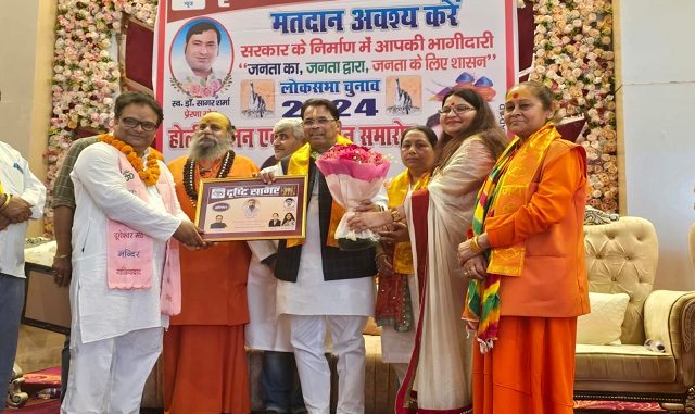 गाजियाबाद। दैनिक दृष्टि सागर द्वारा रविवार को राजनगर एक्सटेंशन स्थित अवध पैलेस में भव्य होली मिलन व अभिनंदन समारोह का आयोजन किया गया। कार्यक्रम को मुख्य अतिथि श्री दूधेश्वर पीठाधीश्वर, श्री पंच दशनाम जूना अखाडा के अंतरराष्ट्रीय प्रवक्ता, दिल्ली संत महामंडल के राष्ट्रीय अध्यक्ष व हिंदू यूनाइटिड फ्रंट के अध्यक्ष श्रीमहंत नारायण गिरि महाराज ने संबोधित करते हुए कहा कि होली ऐसा पर्व है जो देश के लोगों को एकजुट करता है। होली का पर्व बुराई पर अच्छाई की जीत का उत्सव भी है।